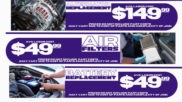 Battery and Charging System Repairs – If your car won’t start, we can replace the battery, alternator, or starter to get you back on the road.